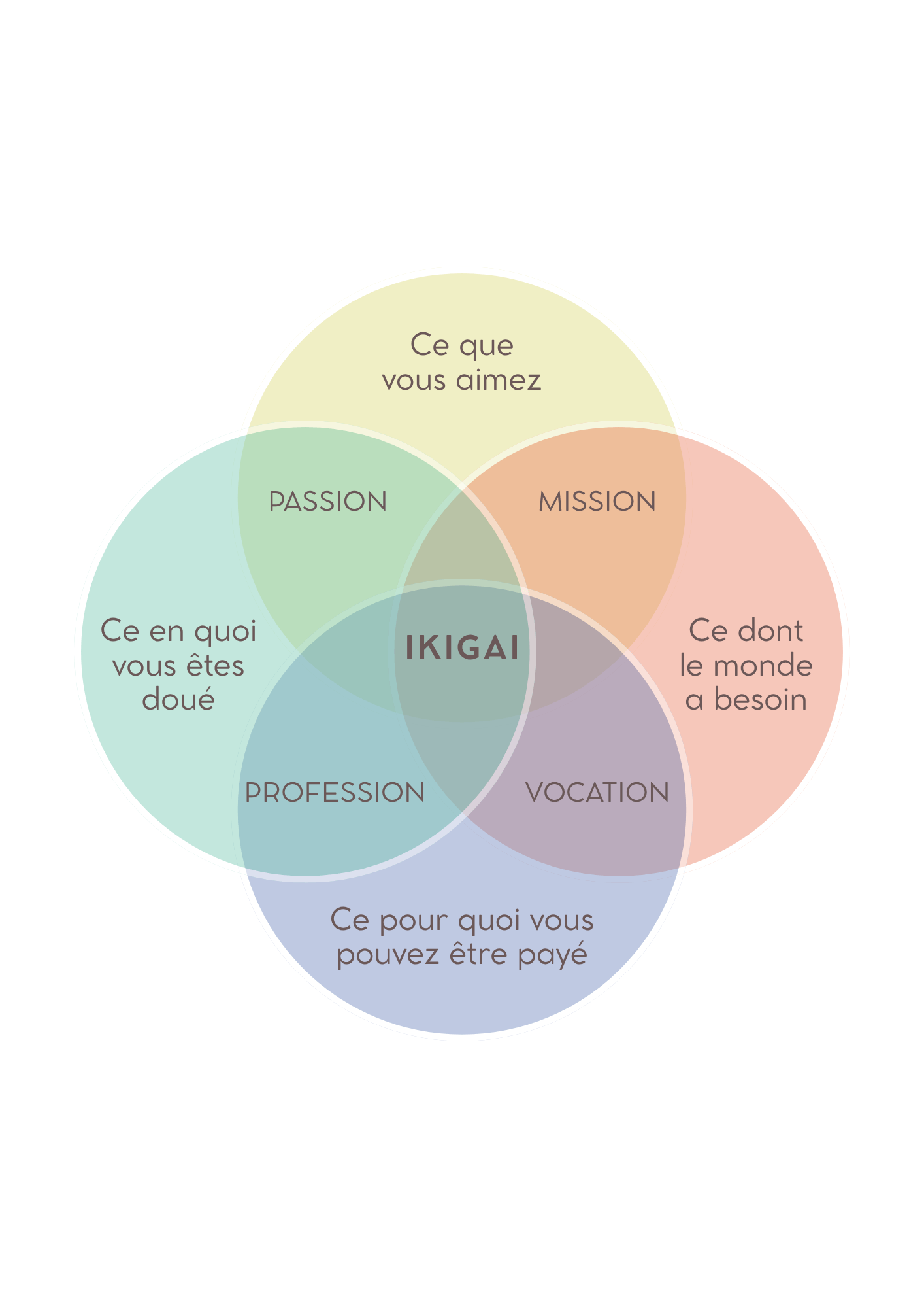 Avant d'être un diagramme en quatre cercles, l'ikigai est un mot japonais qui signifie littéralement « raison d'être » ou « ce qui donne de la valeur à la vie ». Il renvoie à tout ce qui rend la vie digne d'être vécue : une activité que l'on aime, une relation importante, un engagement, ou même de petites routines qui apportent paix et satisfaction.